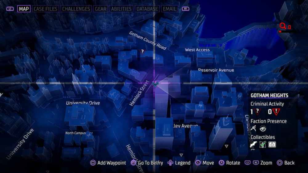 Gotham Heights — Located on top of the “O” of Robbins Insurance Company. The tall building stands out, and can be found near University Drive and Hemlock Street. The player will have to hang from the roof/ledge and shimmy over to secure it.