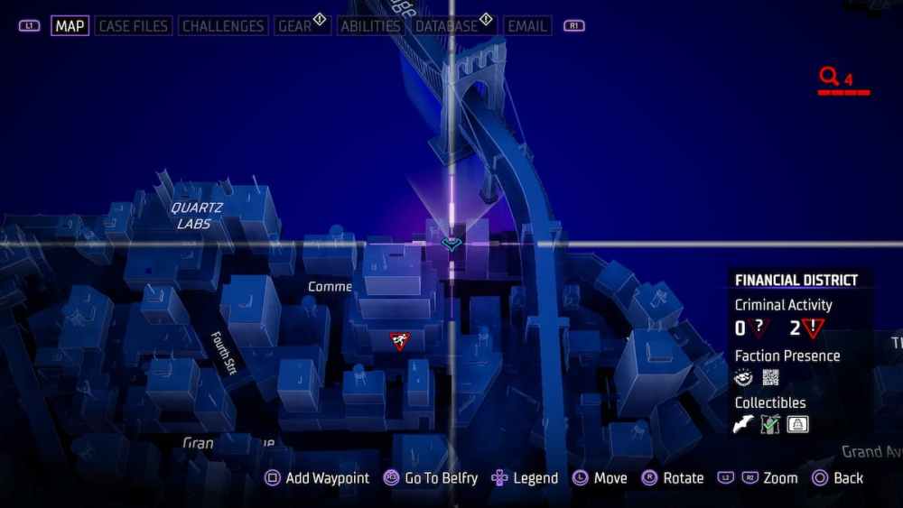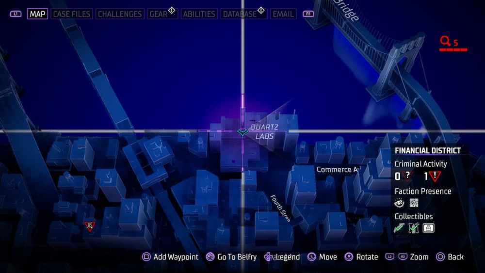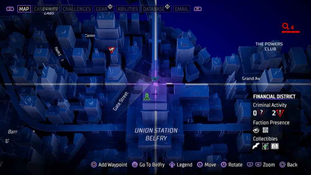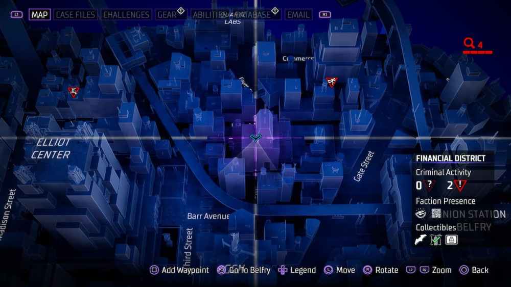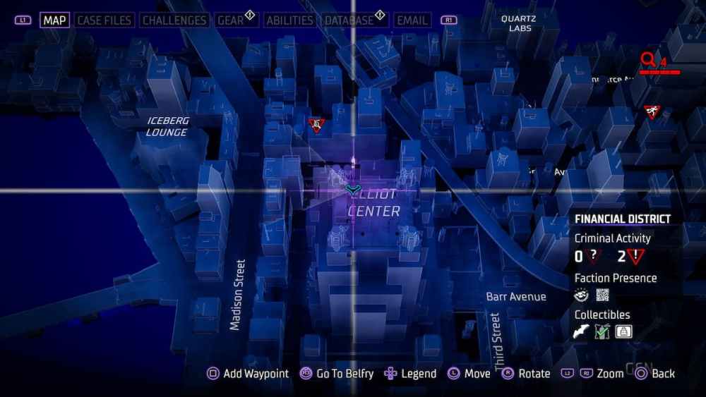 Financial District — Located at the top of the Elliot Center. Another building with a name on your map, another instance of a batarang being easy to acquire.