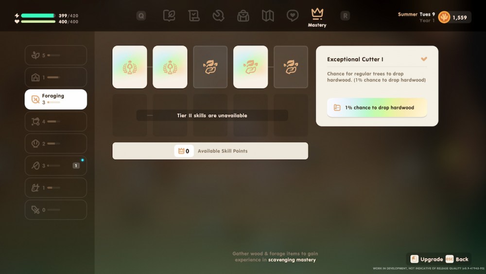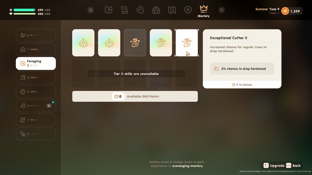 Once you have located the menu and leveled up the required skill, spend your points on the “Exceptional Cutter” skill. You can upgrade the skill later to its second tier. For now, the first level will let you obtain hardwood from regular trees at a 1% drop rate. It isn’t much, but it’s something!