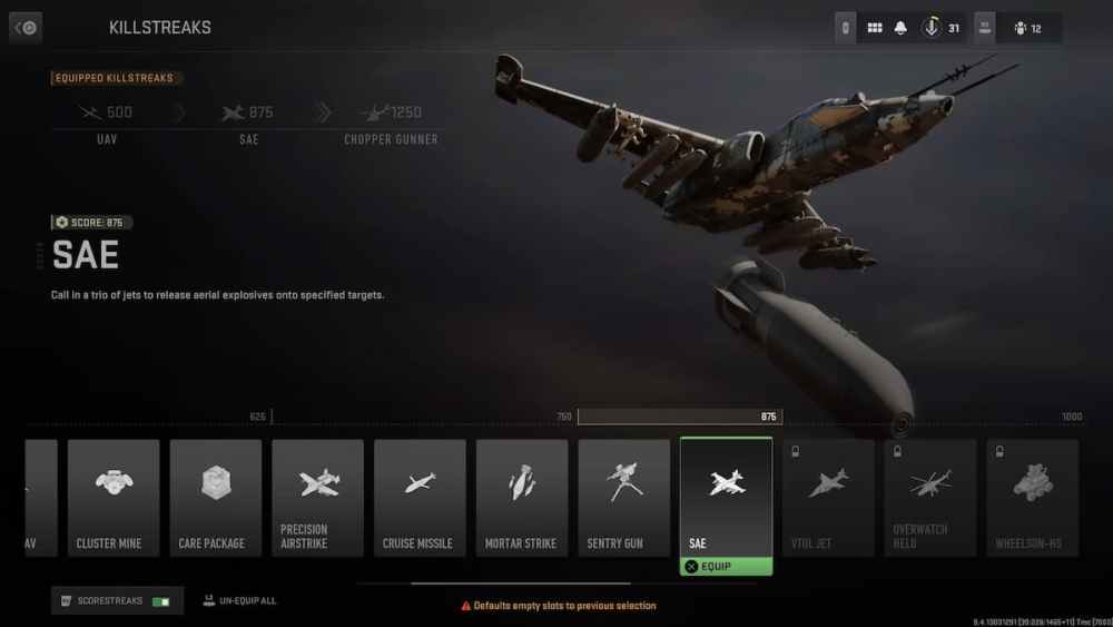 The SAE is the Precision Airstrike you deserve to use. While the Precision Airstrike rains down machine gun fire, the SAE calls in a trio of jets to drop explosive ordinance in three different areas. Extremely powerful, this streak makes the other explosive streaks tremble in fear until you bring the next one up to the plate.