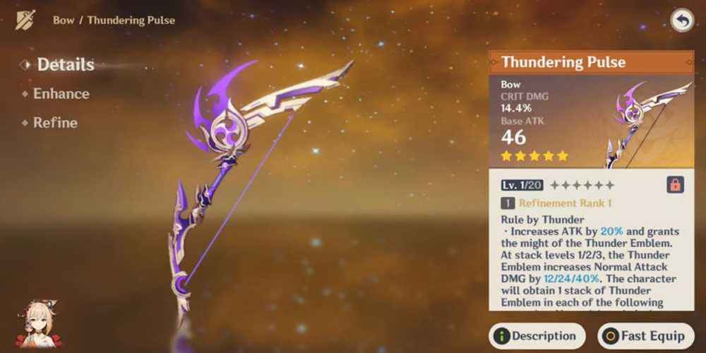 The character who will make the most out of the Thundering Pulse in Genshin Impact is Yoimiya. She is a 5-Star Pyro Bow user that was released back in 2021 as a part of the 2.1 update. Yoimiya is heavily reliant on normal attacks to deal damage; therefore Thundering Pulse will offer a bonus to a significant portion of her damage. In fact, a refinement Rank 1 Thundering Pulse can even beat out a Refinement Rank 5 Skyward Harp.