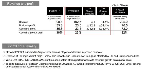 Today Konami announced its financial results for the first half of the fiscal year 2023, which ended on September 30, 2022.