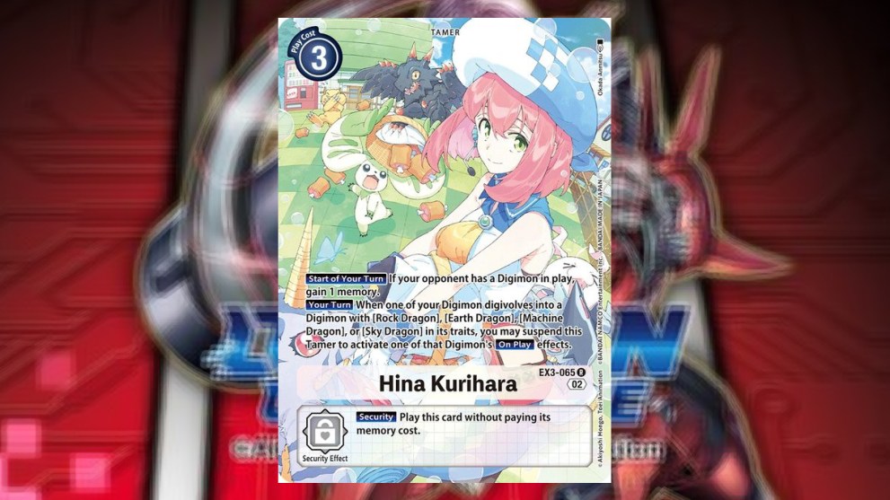 Hina Kurihara is a nostalgic character from the Digimon Links mobile game that’s no longer in service, but she was a memorable navigator for players. In this set, she’s a key tamer that will be the focus of your dragon-based deck that has multiple types such as earth, machine, or sky in its traits.