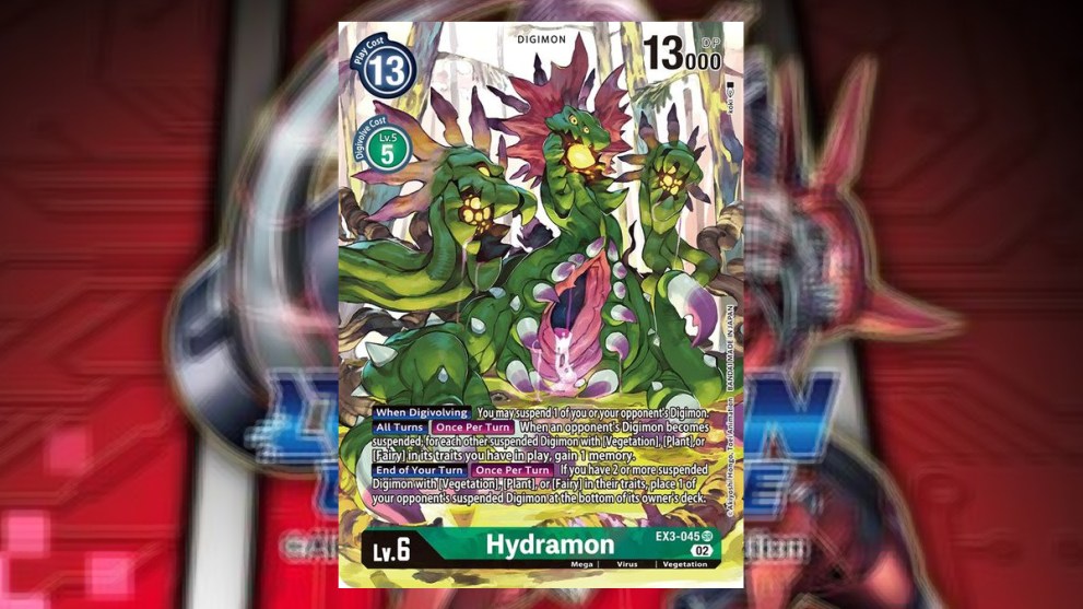 Bloomlordmon struggles with removal and defense outside of one or two key cards but thanks to Hydramon, you can suspend your opponent’s Digimon and put it at the bottom of its owner’s deck as long as you have two or more suspended plant, vegetation, or fairy characters in play on your side. Hydramon also gives you one memory for each of those same suspended cards of yours and synergizes perfectly with Bloomlord since this deck is all about swarming the field. Get ready to go green!