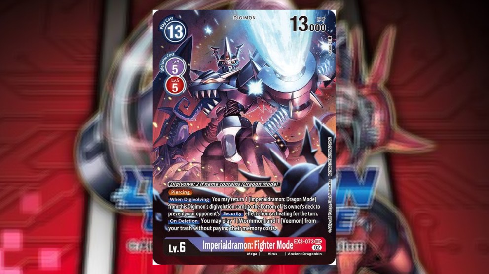 Imperialdramon: Fighter Mode takes the ever-popular fan-favorite Imperialdramon to a purple and red split allowing players to expand the color choices of their decks. This new take on Imperialdramon focuses on a faster more aggressive playstyle that has players getting to level six ASAP and not worrying too much if your Wormmon or Veemon gets destroyed along the process.