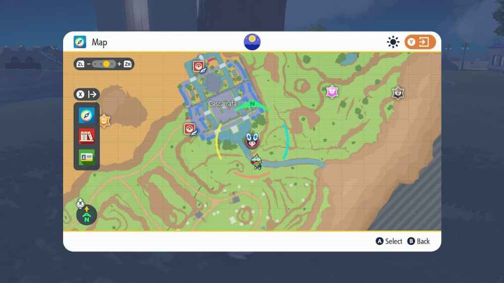 A map to a yellow stake in Cascaraffa from Pokemon Scarlet and Violet.