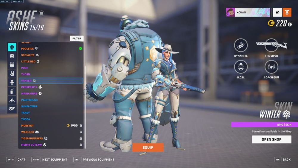 Ashe’s Epic Winter skin is available via the Coldfront bundle in the Overwatch 2 store, paired alongside a victory pose, voiceline and spray. This frosty skin replace’s Ashe’s usual color scheme with winterish blues and whites, giving our beloved Deadlock Gang leader an icey cold appearance. And let’s not forget about B.o.B, matching to Ashe as always with his jacket and little hat.