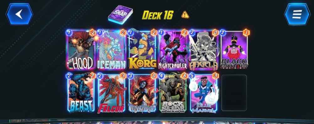 You can then follow this up with Beast, who returns those disruptive cards to your hand and make them cost 1 less, then play them again. Falcon also returns all 1-Cost cards to your hand, letting you deploy The Hood, Iceman, and Korg again for even more disruption. Angela and Darkhawk will be your main power push here, with Mystique in the deck to copy either Darkhawk or Blue Marvel’s ability for additional power.