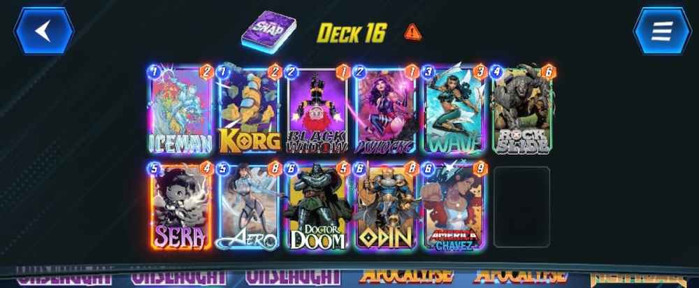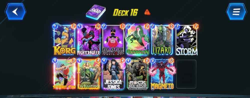 Finally, you can never go wrong with a good ol’ disruption-style deck in Marvel Snap. This deck is really just made up of general-use good cards, as well as counter elements with Shang-Chi and Enchantress. You still have your disruptive elements like Korg, Black Widow, and Rockslide, while cards like Storm and Scorpion help to weaken your opponent’s hand and limit where they can play.