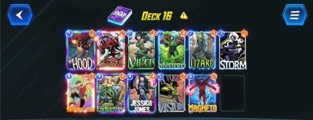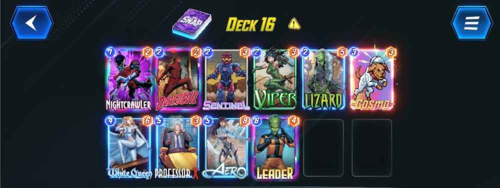 The other supporting cards here make up a control shell, with Daredevil letting you know where it’s safe to play Aero or Professor X, along with White Queen and Leader to give you insight into your opponent’s hand and to gain the upper hand on the last turn.