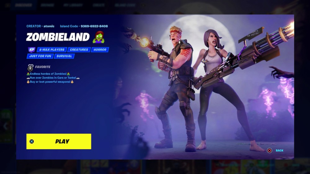 This has been a personal favorite for a while, and we also recommended the first Zombieland map that was released years ago. The setup is relatively simple: there are several different areas of infinitely spawning zombies. Each one is worth a different amount of coins, and you spend these coins on the next level to improve your weapon loadout. Every zombie killed also earns you some XP, though this will diminish over time as you run through your allowed amount of creative XP.