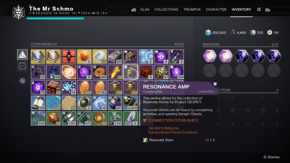 After that, turn four Resonant Stems into an Override Frequency, and it will tell you where to find the node. For example, “Luna.Archer.Dome.Catwalk” can be broken down to the node being found on the Moon, at Archer’s Line, inside the Dome at the Catwalk. Once you find the node, you’ll be able to earn an Ikelos SMG.