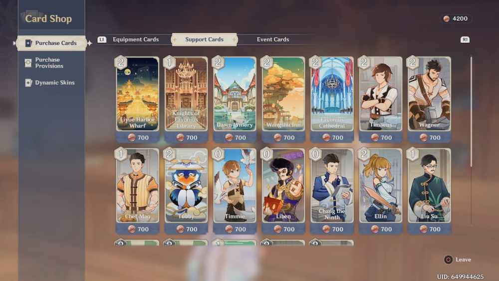 Players can access the Card Shop of Genshin Impact by interacting with Prince at the Cat’s Tail. In this store, you’ll see a wide variety of items, such as Equipment Cards, Support Cards, Event Cards, Character Invitation Letters, Dynamic Skins, and many more. However, the Card Shop has a unique type of currency known as “Lucky Coins,” which can be earned through matches.
