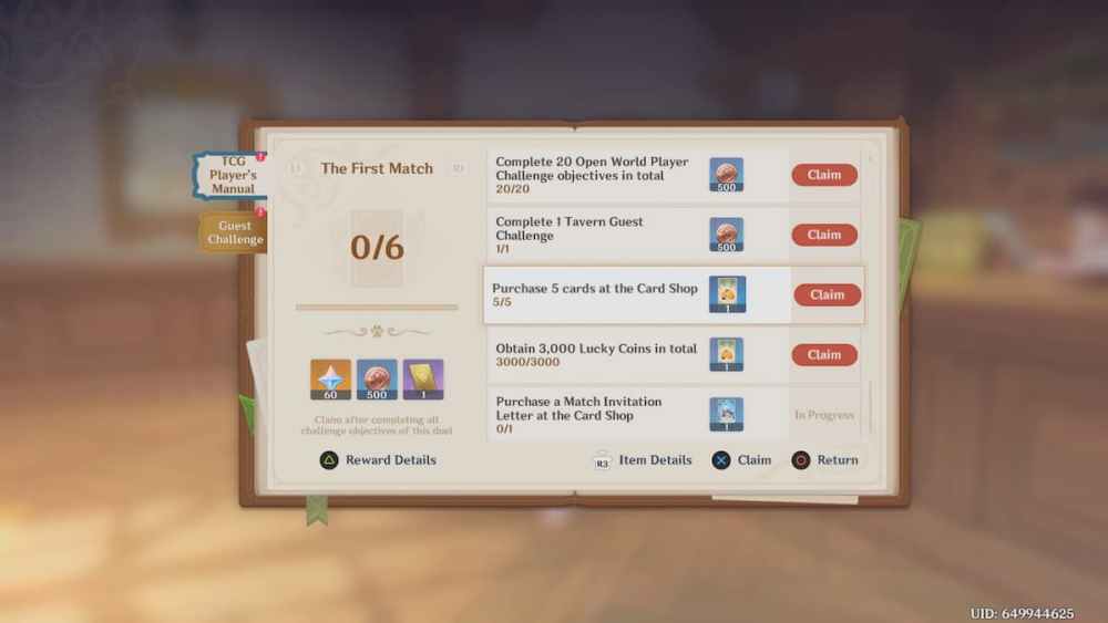 Travelers can access the TCG Player’s Manual at the Cat’s Tail to gain Genius Invokation items. To do this, you must complete challenge objectives, like buying a Match Invitation Letter at the store or obtaining 3,000 Lucky Coins to acquire a card. These tasks can also give you more Lucky Coins to purchase other products at the Card Shop.
