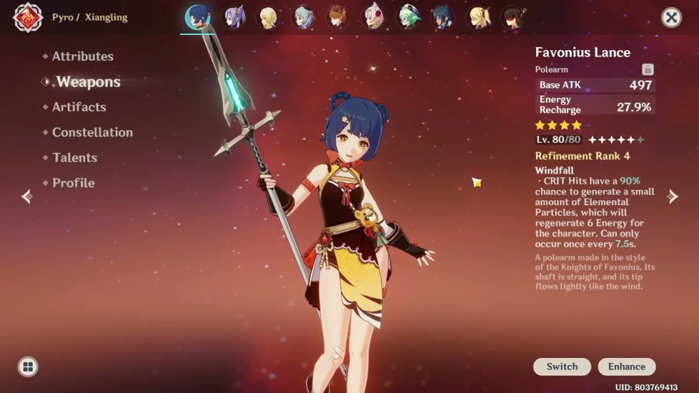 Favonius Lance is currently unavailable to unlock in Genshin Impact, as the weapon’s banner was introduced back in October 2020. So, if you don’t have this polearm unlocked, we recommend equipping the Staff of Homa with the best Yaoyao build. But before that, let’s take a look at the weapon stats: