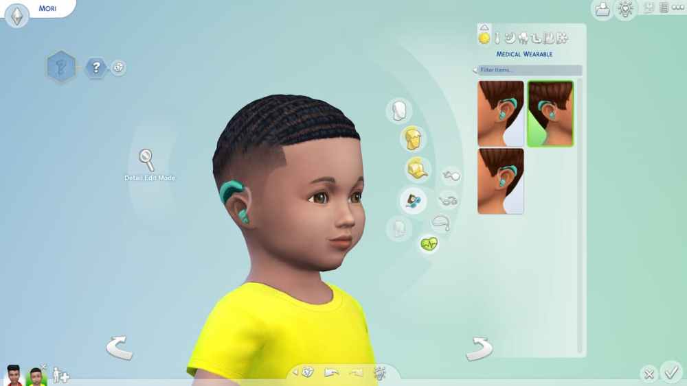 The Medical Wearables category can be found in the Body and Face Accessories section within The Sims 4 CAS. Every item has a variety of colors to choose from, including pink, green, and black. It should be noted that toddlers can only wear hearing aids and cannot access other items in this section.