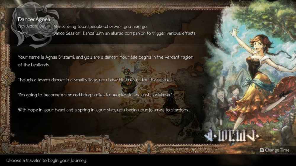 The Dancer is meant to buff the party, and Agnea only has access to the dagger weapon type, making her the weakest character to begin your journey with.