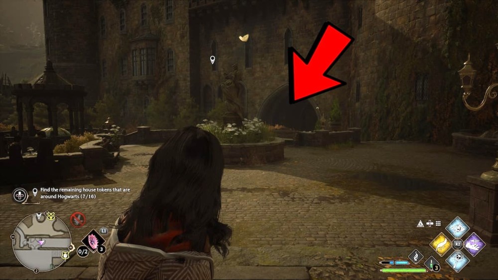 When players reach the Bell Tower Courtyard Floo Flame, they can take a right to go up the stairs and walk through the doorway (where the arrow is pointing):
