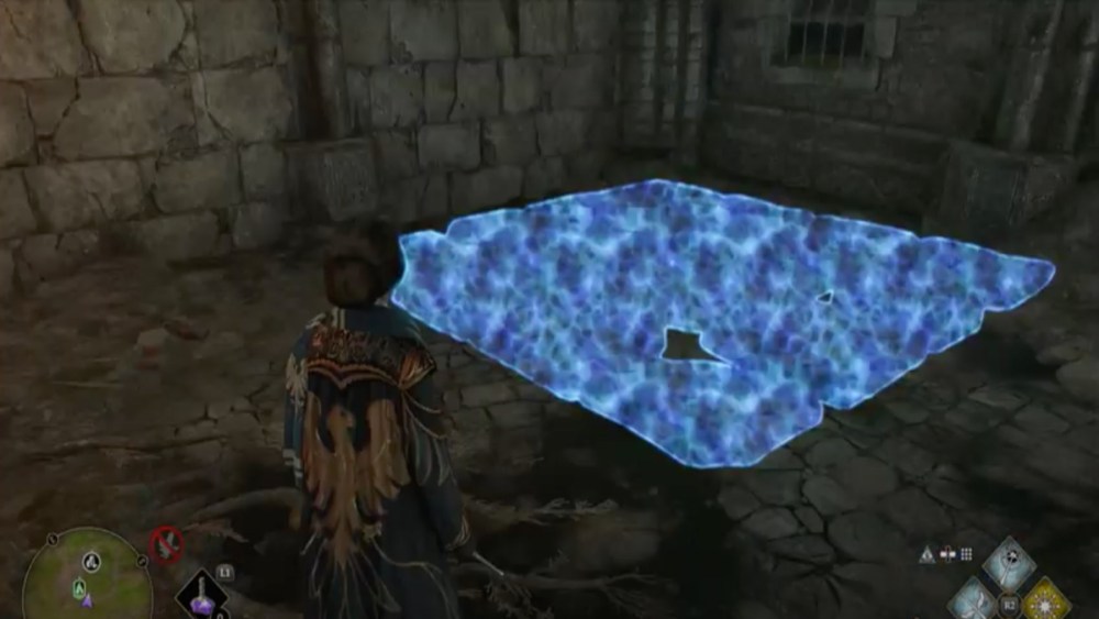Use Revelio to track down the cube on a nearby cliffside, hidden among some trees. Levitate it back over to the pedestal at the bottom of a stairwell lined with braziers. Cast Levioso on the cube to open the vault. Head down the stairs and through the winding corridor to a seemingly empty room. Cast Revelio to reveal portion of the floor shaded blue, and then stand on this spot.