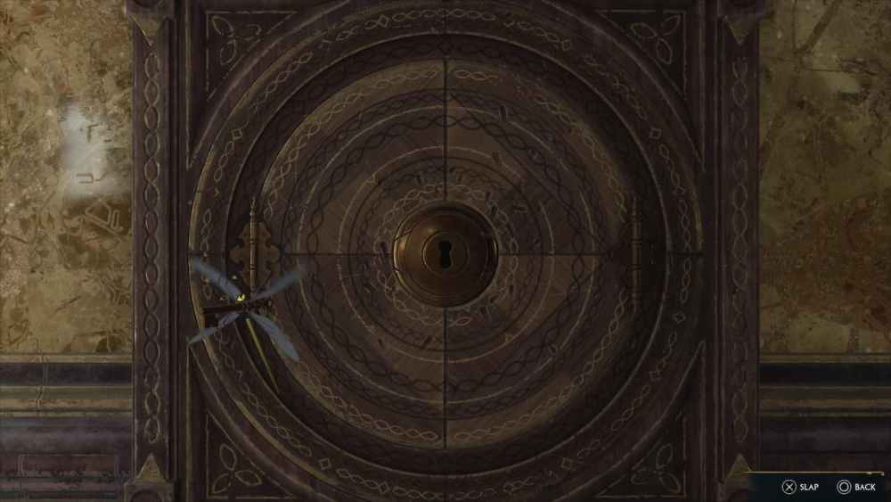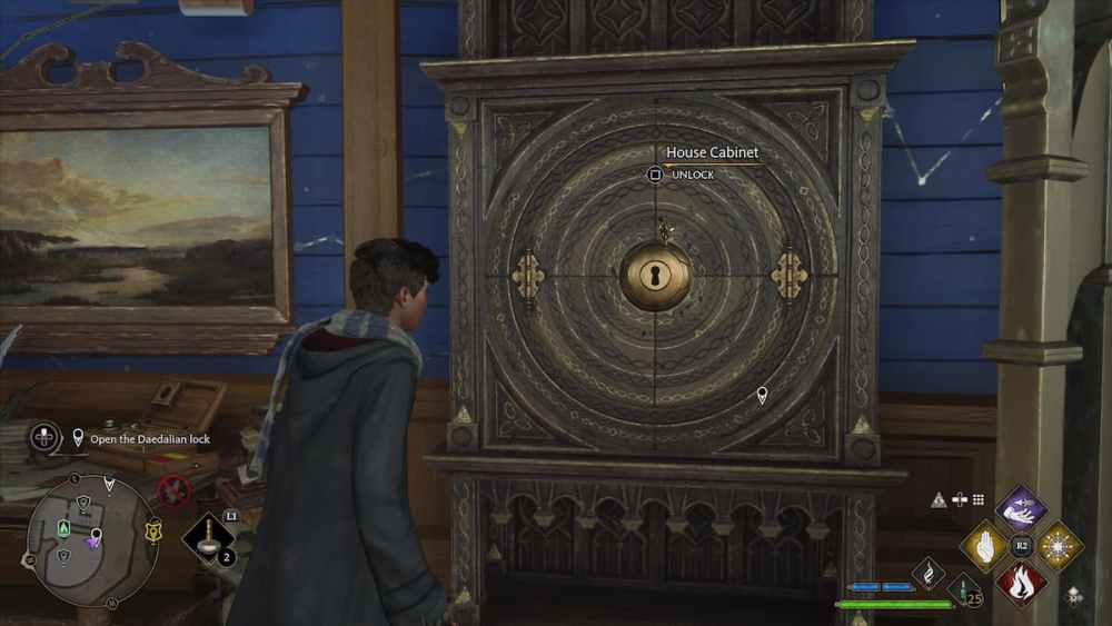 Next, you’re going to need to complete a very brief mini game to unlock the House Cabinet. Don’t worry as it’s fairly simple. All it requires is some quick timing and quick reactions. What you need to do is tap X on a PS5 controller or A on an Xbox controller just as the Daedalian Key flies over the lock.