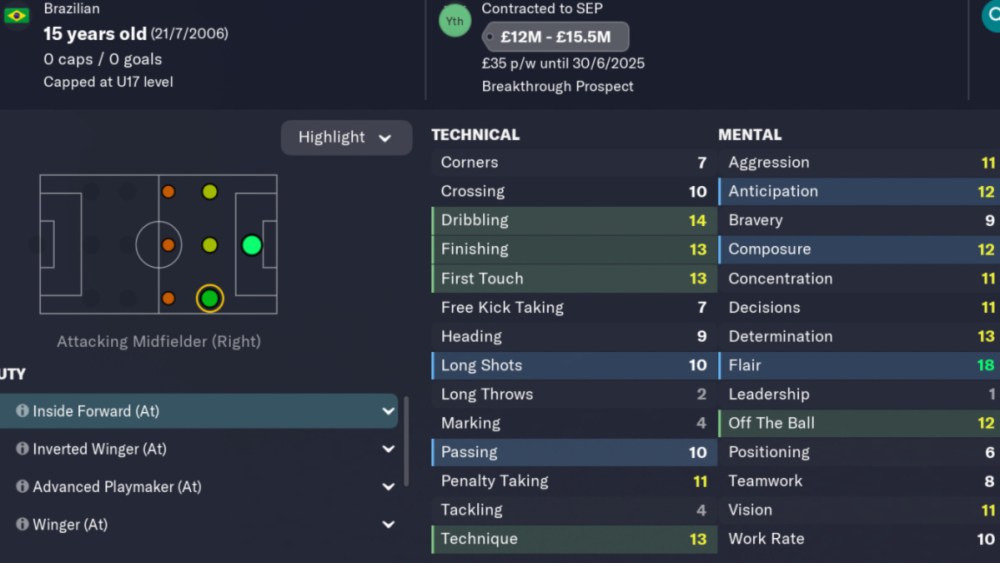 An out and out skillful Winger who can also play through the middle, he is the perfect player to sign for any side fighting for a European place. He’s also a player who is open to signing for just about any big European side, and given he has five star potential and the personality of a model citizen, he could be a force for 10+ years. This is on top of his 16 Technique, 16 vision, 15 flair, 16 dribbling, and 14 pace. With these attributes set to improve over the years, he is a must buy at roughly £7 million, with most anyone able to make that deal happen without damaging their finances too much.