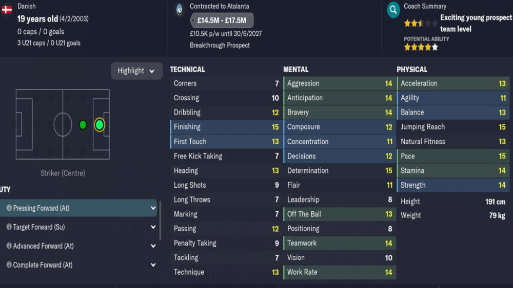 Having just started an Atalanta save myself, Scalvini almost immediately leap frogs all of the other more experienced defenders for a starting spot in the back four. However, if you haven’t started a save with Atalanta, then you will be able to acquire Scalvini’s services for only £30 million. With a four to five star potential, he is well worth the investment.