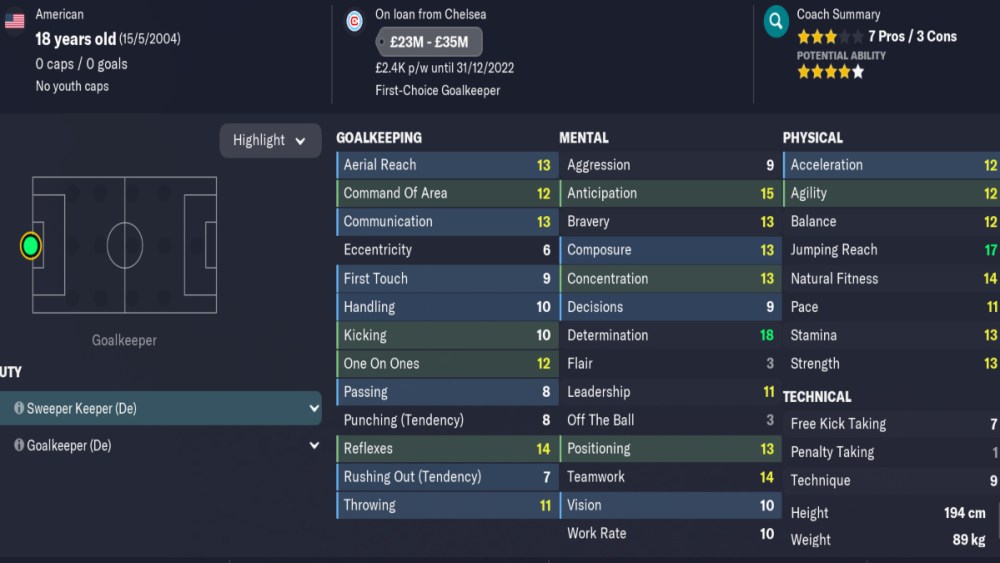 Recently signed in real life by Chelsea from Chicago Fire, they saw it fit to loan him straight back to aid his development. This made the giant of a keeper standing at 194cm with 17 jumping reach, 18 determination, 15 anticipation, and 14 reflexes a real steal for only £8 million.
