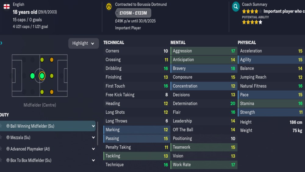 With attributes such as 16 first touch, 16 technique, 20 determination, 17 work rate, 18 bravery, and 16 stamina, he is the perfect world class Central Midfield player for most any team. A five star potential on top of these attributes is the reason why you should be aiming to sign Bellingham at the earliest possible opportunity.