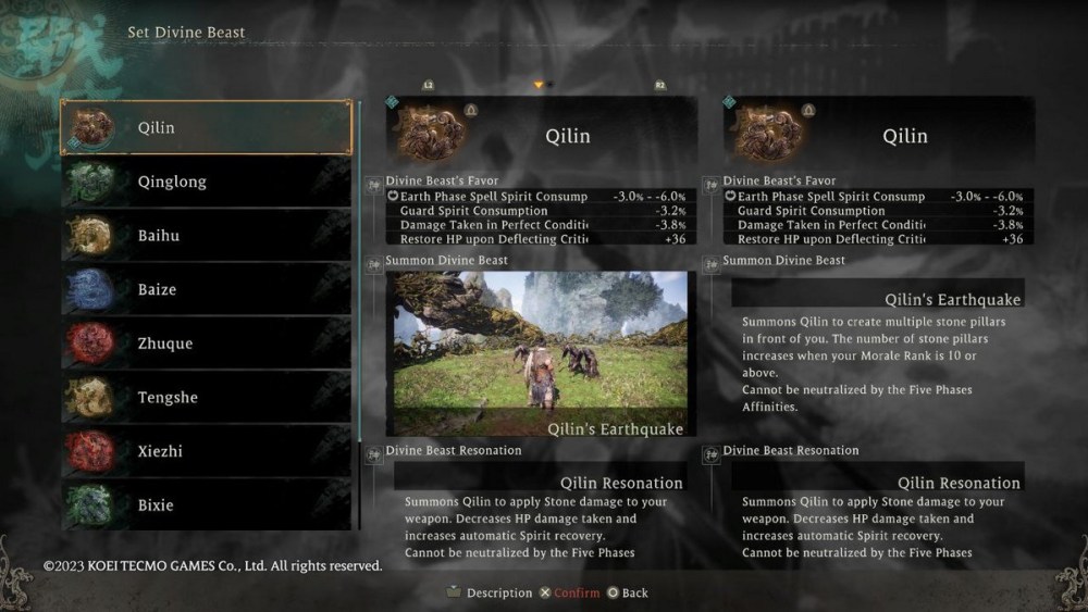 As you meet more worthy allies or enemies in Wo Long: Fallen Dynasty, defeating or befriending them will allow your character to become one with the various Divine Beasts. There are a total of 10 Divine Beasts in the game, each corresponding to one of the Five Phases and comes with a bunch of other bonus effects thanks to its Favor.