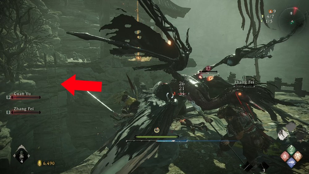 If you want to avoid the battle, you can take the road to your left and climb a ladder that will bring you to the fifth Battle Flag. In my case, I heedlessly entered the arena, forced to fight the Suanyu many times, and only then did I notice the alternate path.