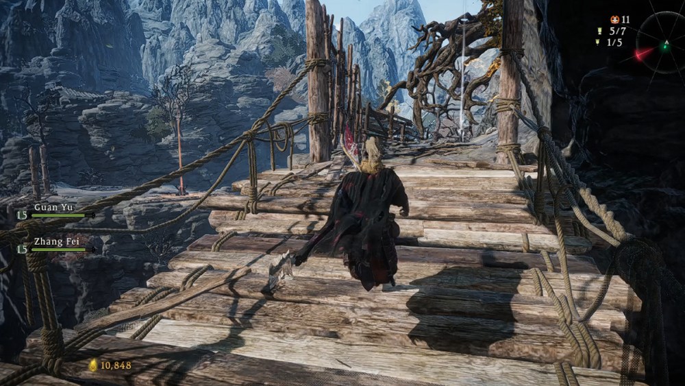 Another important warning. The bridge in front of you is a liar, and it won’t hesitate to drop you into the area below where two Changgui are waiting. Thankfully, you can still climb back up and even encounter a Shitieshou. Your companions will comment that you can feed the creature irons, and it will give you another item as an exchange.