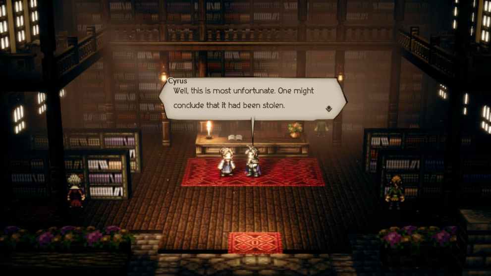 True to his profession as a petty thief, Therion is a jerk, with a story that revolves around him getting into a pickle and having to fetch missing treasures as punishment. The premise isn’t anything too groundbreaking, but it features a fair few compelling cameos, from the butler Heathcote to Therion’s former partner, Darius. It proceeds down an ‘honor among thieves’ premise with a satisfying conclusion.