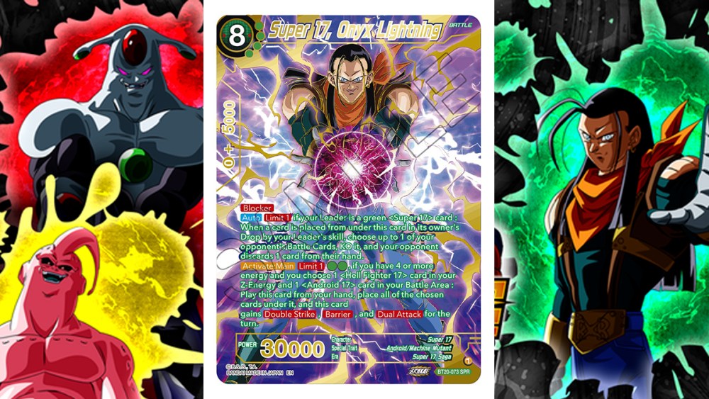 Super 17, Onyx Lightning is the big boss finisher for the green Super Android 17 deck that also hails from Dragon Ball GT. Although it comes at a cost of 8 energy, you can easily play this earlier for only two green energy thanks to its Activate Main ability.