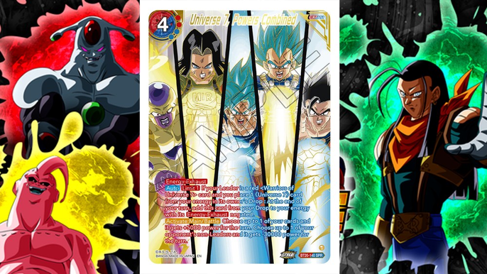 For collectors, this card has a fantastic design in the way it arranges Frieza, Android 17, SSB Goku, SSB Vegeta, and Gohan together in a colorful manga-like panel. For more competitive players, this card has a strong effect that boosts one of your cards by +5000 for the turn and hits your opponent’s Unison or Battle cards for -30000. After all that, it can be swapped into your energy, making this a versatile tool for a variety of strategies.