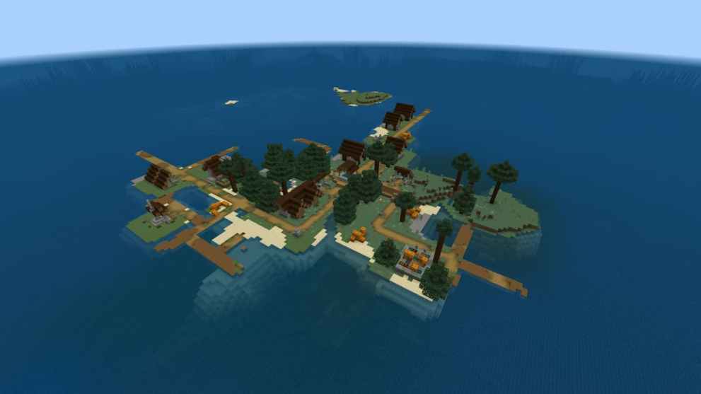 When you want to get away from it all, you can use this seed from GamerNerdGuy to spawn into a remote spruce village island. In this peninsula, players can trade with residents, harvest pumpkins, and smelt ores with the Blast Furnace. Furthermore, this destination is well-protected by the surrounding body of water and the Iron Golem that patrols the island.