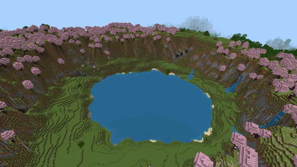 TikTok user Stofix discovered this breathtaking Minecraft seed featuring a lake surrounded by the Trails and Tales’ Cherry Grove. With this area, you could create a relaxing destination within your world by building an island right at the pond’s center or setting up a village around it. Not to mention the fact that there are a few waterfalls that fit well with the relaxing scenery, permitting you to swim up the terrain.