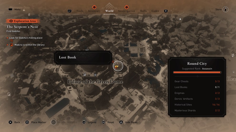 Only available once players have completed the main quest, The Serpent’s Nest, otherwise, the door leading to the Lost Book will be locked. Head to the Palace of the Green Dome in the Round City either via the viewpoint or jumping from the nearby Harem.