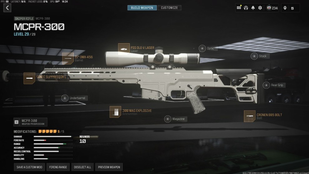 Damage and range are king in Warzone, so we want to maximize both at the expense of every other stat. To start us off we have the Sonic Suppressor L and the 22″ OMX-456 Barrel, which both drastically increase our damage and range to ensure we can hit opponents as hard as possible. An absolute must-have is the .300 Mag Explosive ammunition, as it is the only way for this loadout to one-shot down enemy operators. Since many of our attachments hindered our mobility, we use the FSS OLE-V Laser to mitigate those losses and have a competitive ADS speed.