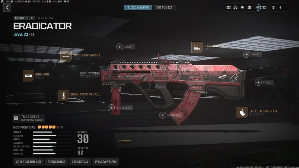 The Geist is known for its strong recoil so we stick on the Bore 490 to mitigate that annoying shake as much as possible. The LOC.2 Short Barrel and Tactical Grip Tape bring the AR into the MW3 META of fast-paced chaos. Our Bruen Pivot Vertical Grip helps with more recoil control and stability so our shots aren’t uncontrollably hitting the ceiling.