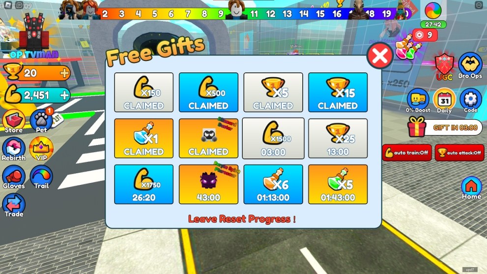 Codes aren’t the only source of free stuff. In Bro Liberation: Punch Toilet, there are gifts you can claim every so often, as long as you stay in-game, daily rewards, and a prize wheel. Every now and then, there are also free pets to collect after you’ve spent a specified amount of time in the game.
