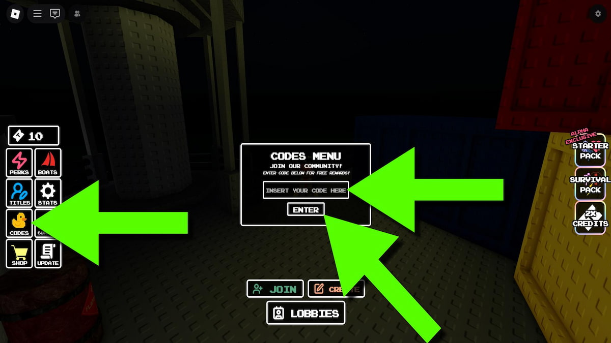 - Click the Codes button on the left side of the screen while in the lobby.