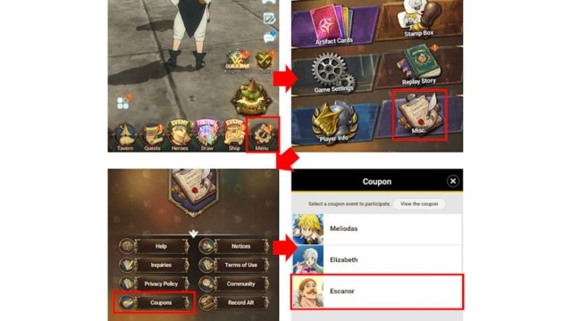 Once complete, you can open the Menu and select the Misc option. You’ll want to then select Coupons and click on Escanor to open up the text box needed to redeem any of the above active codes.