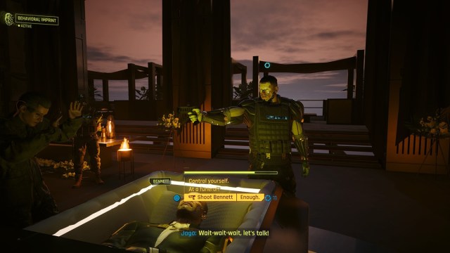 If you shoot Bennett, the crowd riles up a little bit but settles. As Jago lived, you will be given 8,000 Eurodollars as a retainer for Aguilar’s services. You also get a little Street Cred and XP for that choice.