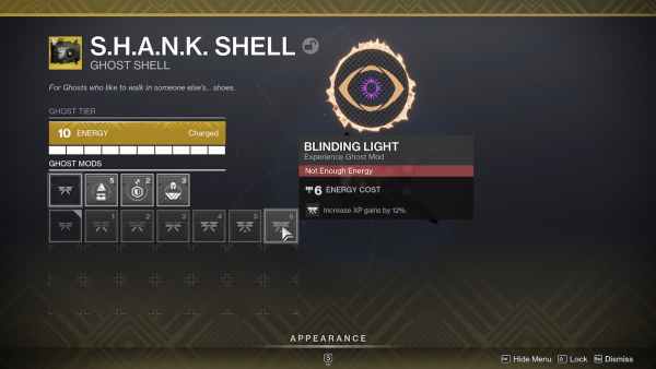 Second, set up the Blinding Light mod on your Ghost. This mod needs six energy at the highest level and is placed in the first mod slot of your Ghost. It will grant you 12% bonus experience or lower amounts depending on which version you use. As long as you are on the chase for experience in order to rank up a vendor, or your Artifact, you should always have this mod equipped.