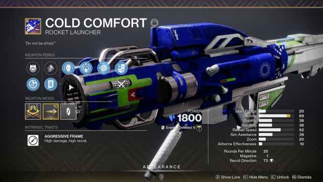 The reason the Cold Comfort is so good is because of how Envious Assassin and the Restoration Ritual Trait work together. Envious Assassin will overflow your magazine when you switch to the weapon based on how many kills you got in the previous 10 seconds with your other weapons. Slay out, and you’ll be able to switch to a Cold Comfort with three rockets waiting in the magazine. When you do that, you can simply stow the weapon, and you’ll have three rockets there when you need them. You won’t lose them if you wait a while to fire.