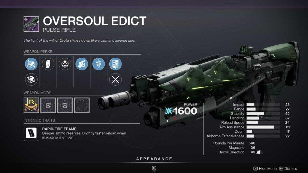 Ironically, you don’t obtain the Oversoul Edict Pulse Rifle by defeating Crota in the Crota’s End Raid. Instead, the weapon will only drop by completing the Bridge encounter or defeating Ir Yut, The Deathsinger. Completing either of these triumphs will not guarantee a drop of the gun though, as other loot can also be obtained. However, given that the Raid is farmable for the Season, running each of these encounters a few times will eventually drop the gun.