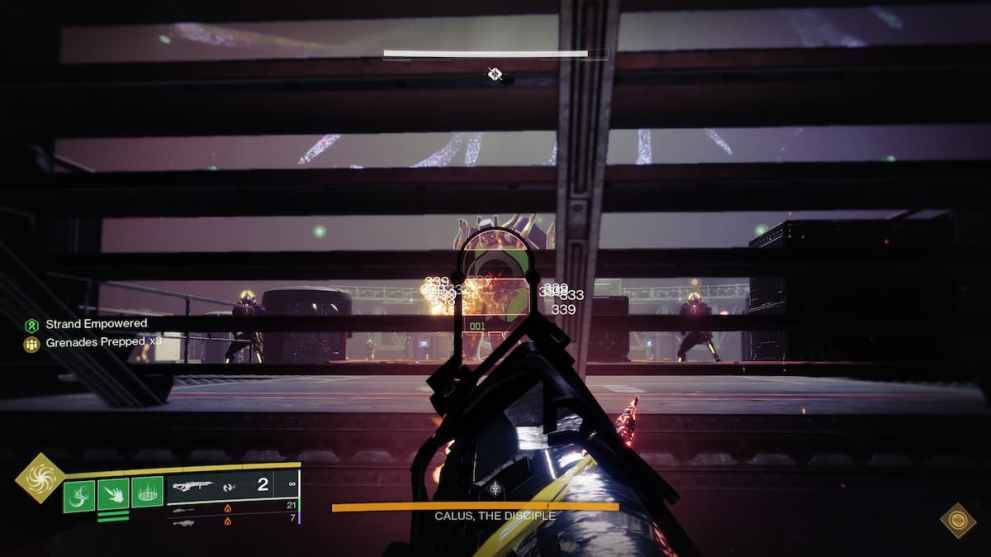 During Phase 2, Calus will yell at lot to the Witness, and then a large purple bubble will cover the area. When this happens, players will notice they will start receiving the Joining Fireteam countdown. At the first sign of this, use the Strand Grapple to grapple up on top of the purple bubble.