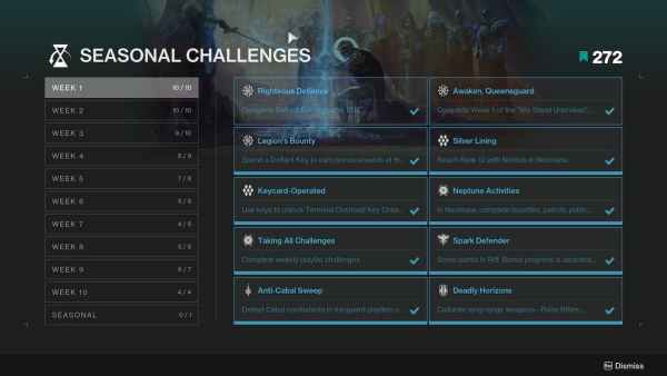 Each week, Destiny 2 introduces new Seasonal Challenges. They can involve completing certain activities, killing enemies in specific ways, doing bounties, or engaging with late-game content. They are also worth large amounts of experience and will give players a tremendous boost in levels each week. If you are in a rush to level up, make sure you are completing as many of them as you can. You can also be smart and combine doing these with the next step.