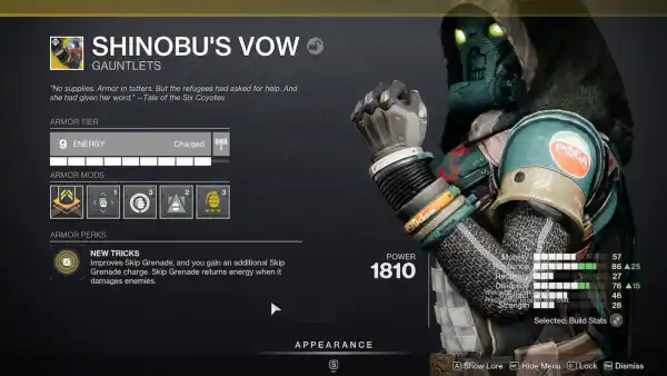 The in-game description dramatically undersells Shinobu’s Vow, describing it as merely “improving skip grenades.” What it actually does is give you an extra grenade charge, damaging enemies returns grenade energy, and they track further and more aggressively. This is a massive buff to the grenade and makes it practically impossible to miss. When we combine it with our mod set-up, the right attack can return huge volumes of grenade energy thanks to the aforementioned Lightning Strikes Twice mod. You will also have Ionic Traces coming your way, constantly feeding you both additional grenade energy and Armor Charges.