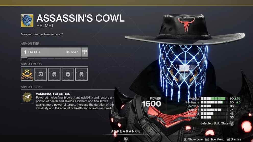 Now we’re moving on to the best Hunter Exotics that go hard in one way or another. In the Assassin’s Cowl’s case, Powered Melee and Finisher Kills turn you invisible while restoring health. This buff is endlessly chainable, on top of giving longer invisibility and more health based on the enemy you kill. For example, Minor enemies give roughly 7 seconds of invis and 100hp, while Minibosses and Bosses give around 13 seconds and 200hp.